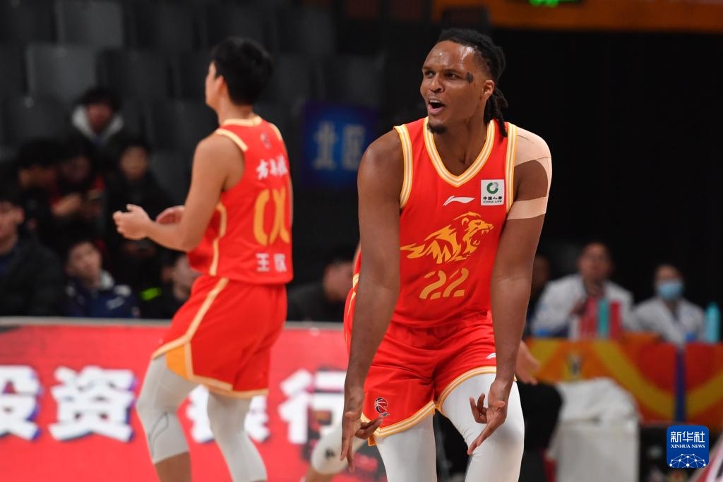 12月4日,浙江方兴渡队球员卡尔顿(右)在得分后庆祝。