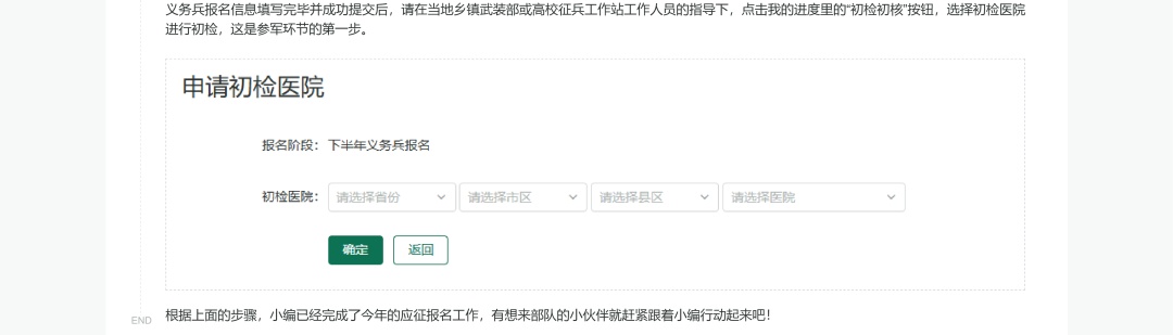 义务兵报名信息填写完毕并成功提交后,请在当地乡镇武装部或高校征兵工作站工作人员的指导下,点击我的进度里的“初检初核”按钮,选择初检医院进行初检。