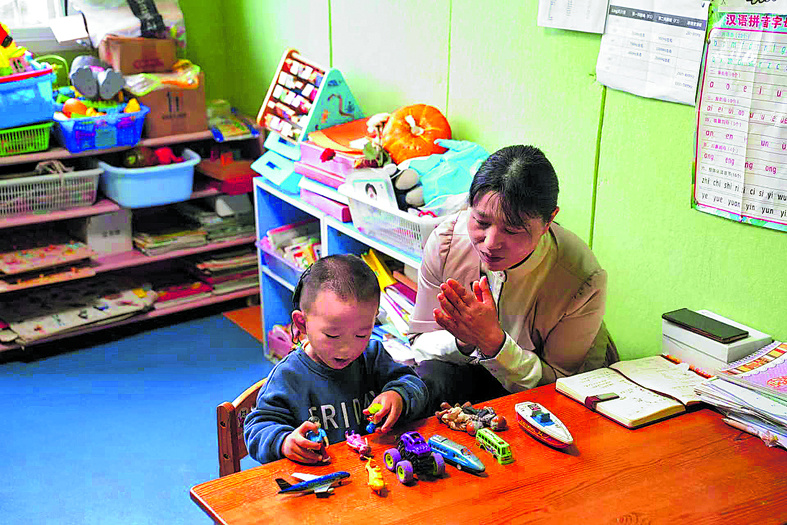 在江西鹰潭市特殊需要儿童康复中心,曹有红给孩子上课。 吴思瑜 摄