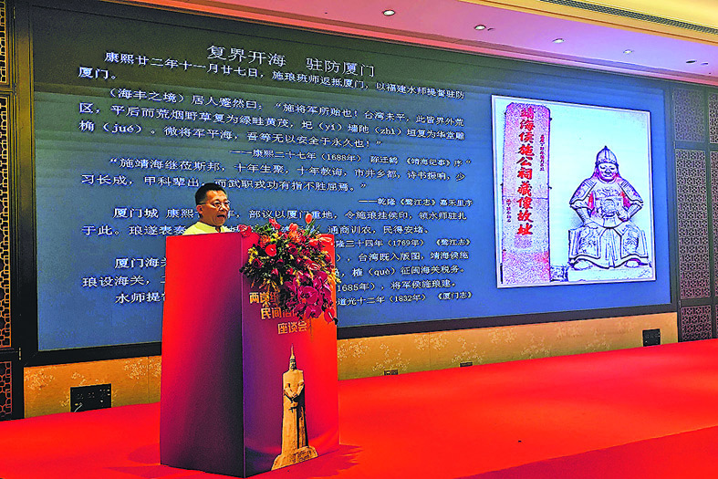 当天,“两岸统一与施琅的民间信仰”座谈会在厦门举行,施伟青在会上阐述施琅的民间信仰形成逻辑。