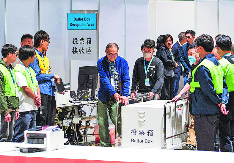 12月7日23时30分许,香港特区第八届立法会选举投票结束,随即开始点票工作。图为工作人员将选举委员会界别的首批投票箱运抵位于香港会议展览中心的中央点票站。中新社记者 侯宇 摄